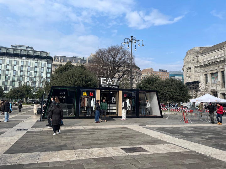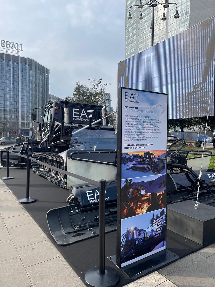 In stazione Centrale, Emporio Armani è presente invece con container nero con all’interno alcuni prodotti da sci e il maxi EA7 Snowcat. Il brand ha inoltre pensato a una competizione “olimpica” per le strade di Milano: dopo aver ritirato l’EA7 Slalom Pass, sarà possibile collezionare timbri in 4 tappe della città (l’impronta di gara per testimoniare il passaggio) e raggiungere il traguardo in store per ritirare una spilla. Interessante metodo per coinvolgere le persone e farle passare per le diverse “case” del brand in giro per la città.