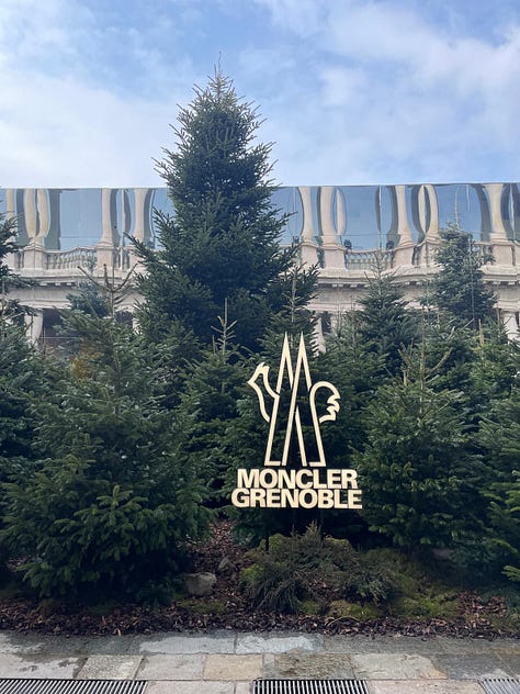 Partiamo con una delle mie location preferite, il cortile di Portrait Milano. Qui, Moncler Grenoble ha aperto la mostra Moncler Grenoble Beyond Performance, che racconta il rapporto del brand tra moda e performance dall’alta quota alla vita urbana, attraverso capi che hanno fatto la storia (come la Paninaro Down Jacket autografata da Alberto Tomba). L’attivazione si presenta come una maxi struttura riflettente (al cui interno è possibile visitare la mostra) mentre all’esterno è incorniciata da alberi e piante che invadono praticamente tutto il cortile.
